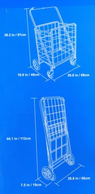 Folding Shopping Cart. 26.8"Wx18.9"Dx32.8"H (open); 26.8"Wx7.5"Dx44.1"H (folded);