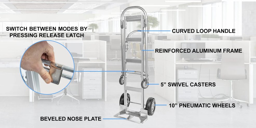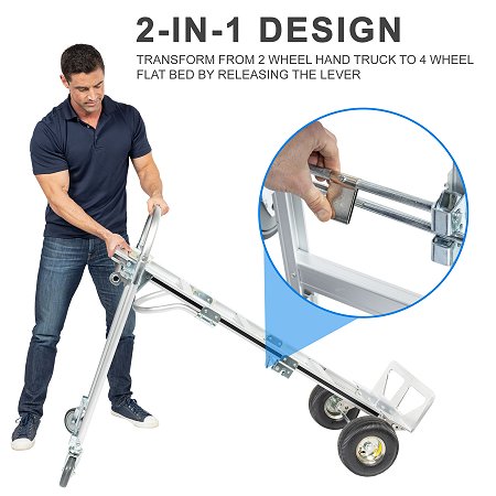 - Convertible 2-in-1 design: Easily shifts from an upright hand truck to a four-wheel cart for versatile use.