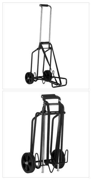 telescopes cart closed for space-saving storage and portability. Sturdy parallel stair glides. Guards in front of wheels protect soft cases.