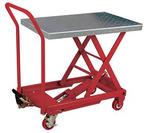 The HTRUS 500-lb. capacity hydraulic table cart enables user to lift or lower heavy cargo easily for loading or unloading, using foot pedals. Features durable diamondplate steel table and smooth-rolling casters.