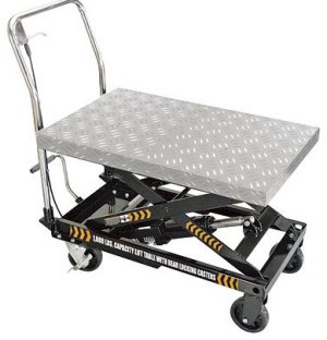 Hydraulic foot pedal pump for smooth lifting and slow release valve in handle for controlled lowering with heavy loads. Minimum height: 11in.; maximum lift height: 33 7/8in. Double ball bearing neoprene swivel casters (2 locking). Chrome handle and aluminum treadplate top for safely securing loads.