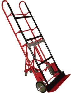 Ideal for vending machine delivery. This heavy-duty appliance hand truck with kick back swivel wheels for support features exceptional stair-climbing ability and auto-rewind ratchet belt tightening. Two 8" cast iron center rubber wheels plus two retractable 3-1/2" aluminum alloy rubber casters to support heavier loads.